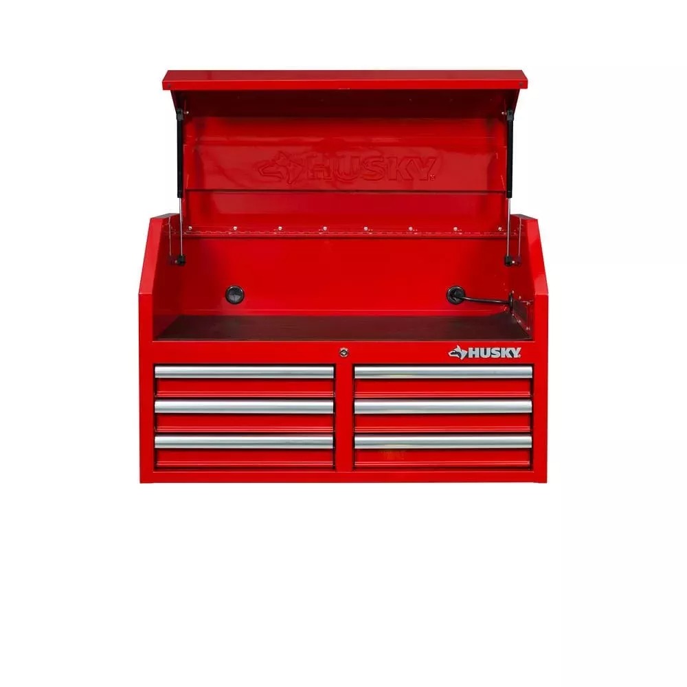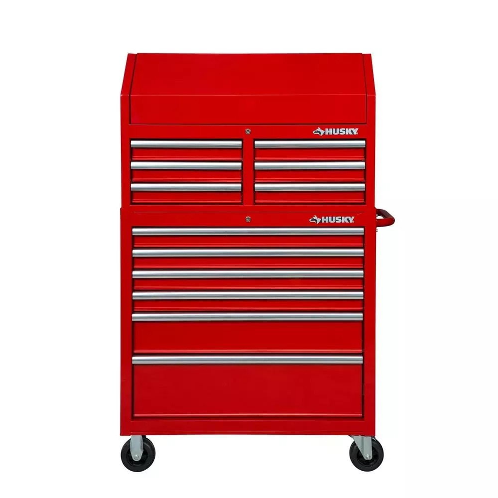 - This Husky 36 in. 12-Drawer Tool Chest and Cabinet Combo is great for storing and organizing all your tools and hardware. The combo tool chest is made from high grade all welded steel construction and finished with Husky Vintage Red. 12-Drawer tool chest and easily accessible top till provide a total of 21865 cu. in. storage capacity. Drawer are all full-extension and glide effortlessly on ball-bearing slides that can support up to 100 lbs. These slides also have a unique Secure Latch retention system that ensures your drawers are completely closed and secured. 1-drawer of tool chest came with a removable worktable for 13 or 15 laptop or phone while drawer open and worktable could fit in any drawer of tool chest. Magnetic labels for the tool storage could be seen from outside of drawer. Premium Drawer Liners included to protect your tools and drawers. Power tool rack set up in the bottom drawer of tool cabinet. The reinforced top lid is supported by gas struts which make it easier to open and close. An ergonomic handle and 5 in. x 2 in. casters allow you to easily move your cabinet around your workspace. Total weight capacity of the cabinet is 1200 lbs. Both the chest and cabinet have an internal keyed locking system with 2 Husky Y-11 keys provided for added security.