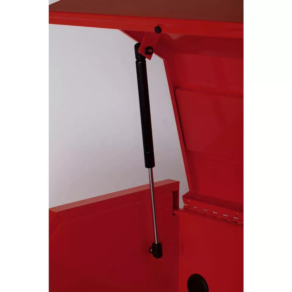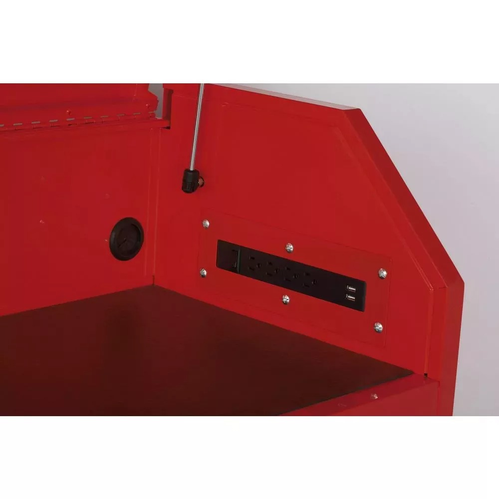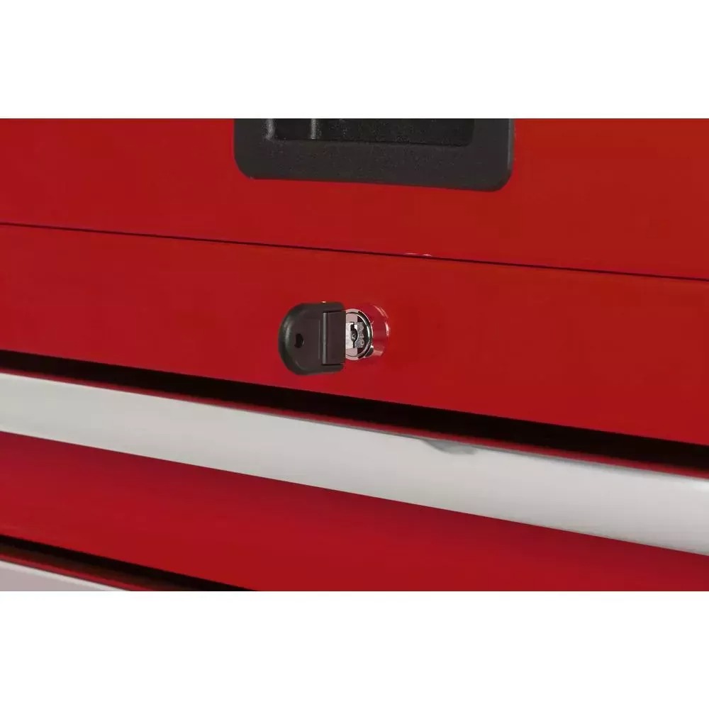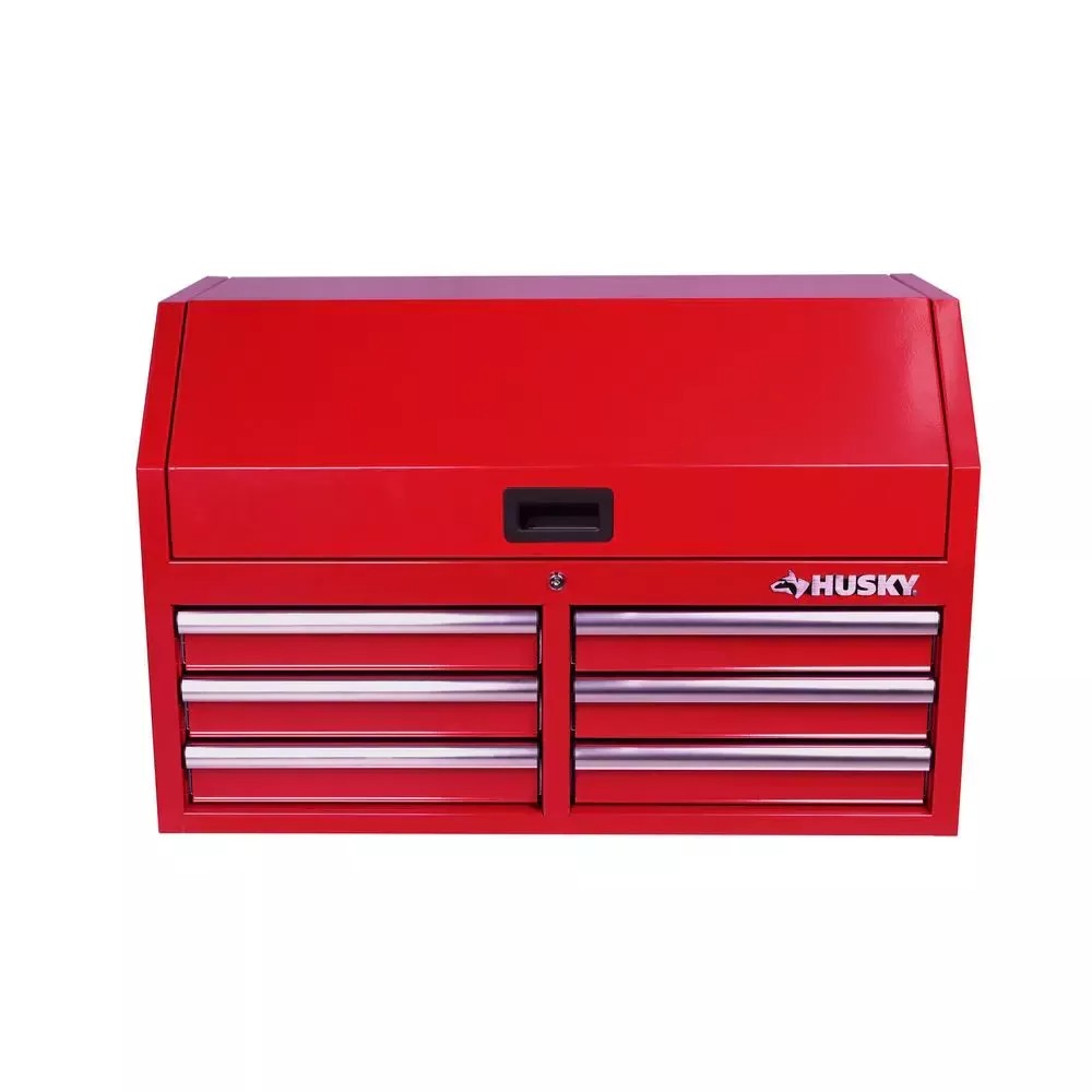 This Husky 36 in. 6-Drawer Tool Chest in Red is great for storing and organizing all your tools and hardware. The chest is made from high grade all welded steel construction and finished with a tough industrial red powder coat paint. 6-Drawers and easily accessible top till provide a total of 8741 cu. in. of storage capacity. Drawers are all full-extension and glide effortlessly on soft-closing ball-bearing slides that can support up to 100 lbs. The reinforced top lid is supported by gas struts which make it easier to open and close. An integrated power strip with 4 outlets and 2 USB ports allow you to charge your tool or other accessories from within the chest. Recessed aluminum side handles make it easy to lift and move the chest around your work space. The chest also has an internal keyed locking system with 2 keys provided for added security.