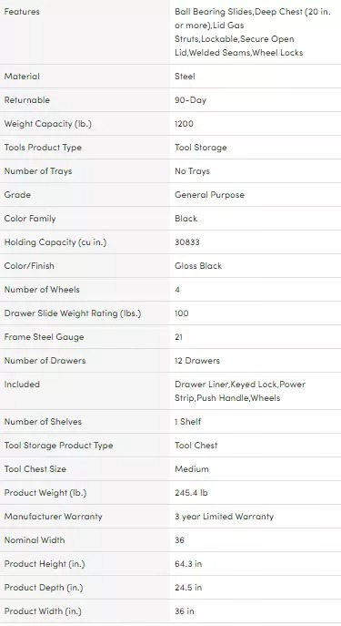 - When you buy a 36 in. W 12-Drawer Deep Combination Tool Chest and Cabinet Set in Gloss Black online from Our Store we make it as easy as possible for you to find out when your product will be delivered.If you have any questions about your purchase or any other product for sale our customer service representatives are available to help.Whether you just want to buy a or shop for your entire home Our Store has a zillion things home.