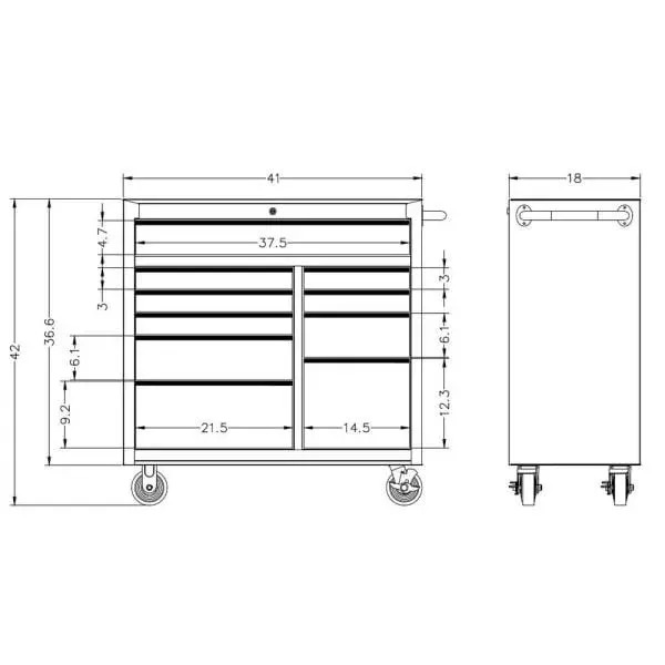 Keep your workshop clean with the Husky 41 in. 10-Drawer Tool Cabinet in Black. Designed to offer increased durability it has a heavy-duty 21-Gauge steel construction great for both DIYers and professional craftsmen. This Husky tool storage system is made with a powder coated finish designed to increase resistance to corrosion weather and staining. It has 5 small drawers 4 medium and 1 large and features a total holding capacity of 14313 cu. in. offering plenty of storage for all your equipment. Excellent for effortless operation this Husky high-quality tool cabinet is made with ball bearing slides that can hold up to 100 lbs. to accommodate heavy loads. This high-quality tool cabinets comes with a Y-11 lock to offer you peace of mind. 5 2 PP Casters and features a recessed handle for convenient storage and easy transport. Keep your workshop clutter-free with the Husky 41 in. 10-Drawer Tool Cabinet in Black.