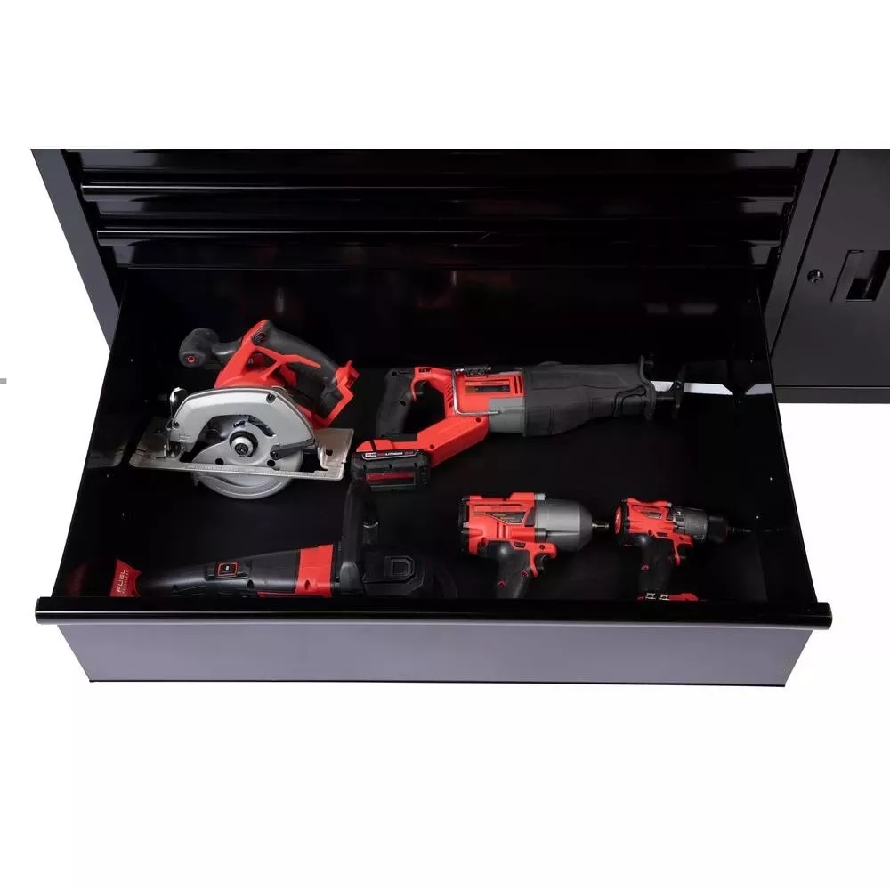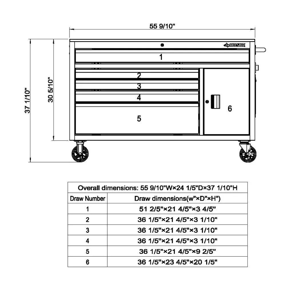 The Husky 56 in. W x 24.5 in. D 5-Drawer Mobile Workbench with Solid Wood Top is a new and exciting configuration in the Husky mobile workbench lineup. This workbench has an all-welded steel construction and is available in a variety of powder coat finishes. This unit has a solid wood top that creates an expansive 1372 sq. in. to work on any project. Each drawer opens and closes easily on ball-bearing slides that are rated for up to 120 lbs. and features a soft-closing retention system that prevents the drawers from slamming closed and ensures they stayed closed. The bottom drawer has 2 sets of slides to accommodate even heavier tools and supplies. All drawers have pre-cut liners included to protect your tools. On the right-hand side of the workbench is a bulk storage area that provides 6430 cu. in. of storage space and an adjustable shelf rated for 130 lbs. The right-hand exterior side of the workbench has an integrated power strip with 6 power outlets and 2 USB ports that allows you to keep your tools and electronic accessories always powered up. Making this workbench mobile are four 5 in. x 2 in. casters with stylish hubcaps that can support up 1200 lbs. and an ergonomic tubular push handle. Finally have piece of mind knowing your tools are secured with the internal locking system.