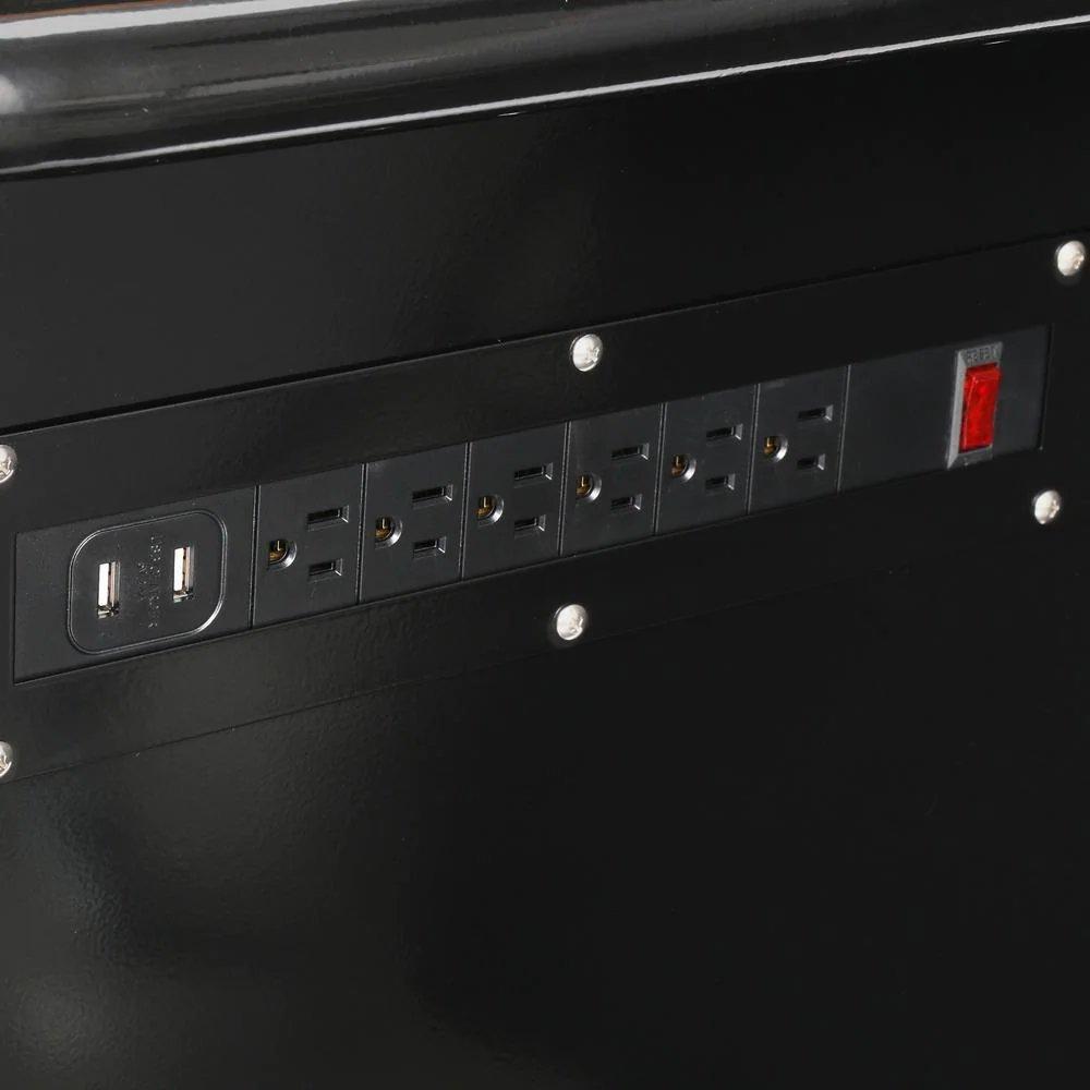 The Husky 62 in. 14-Drawer Mobile Workbench is a tool cabinet that combines the perfect blend of drawer storage capacity and functional work surface area for the tool enthusiast. This rolling tool cabinet has heavier 21-Gauge steel. This workbench is 24 in. deep which is 6 in. deeper than most standard rolling tool cabinets providing more usable storage space that is strong enough to support 1600 lbs. and has 31721 cu. in. capacity. The 1 in. thick solid wood top is sealed with a protective polyurethane coating to protect it from the elements. The workstation is equipped with a power center with 6 outlets and 2 USB ports. Premium drawer liners are included to help keep tools from moving around. Each drawer is equipped with 100 lbs. rated soft closing ball bearing slides. The 2 deeper bottom drawers have double 100 lb. rated slides to enable you to store your heavier bulk items. This mobile work center has 6 large 5 in. x 2 in. all swivel casters and a steel tubular side handle which allow you to easily move around even when fully loaded. The Mobile Work Center also has an internal keyed locking system with 2 keys provided for added security.