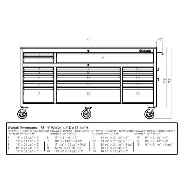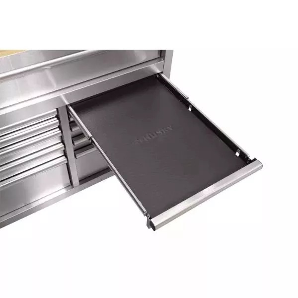 The Husky 72 in. 18-Drawer Mobile Workbench in Stainless Steel is a tool cabinet that combines the perfect blend of drawer storage capacity and functional work surface area for the tool enthusiast. It is constructed with heavier 21-Gauge steel. This workbench is 24 in. D which is 6 in. deeper than most standard rolling tool cabinets providing more usable storage space that is strong enough to support 1800 lbs. and has 33545 cu. in. capacity. The 1 in. thick solid wood top is sealed with a protective polyurethane coating to protect it from the elements. The workstation is equipped with a power center with 6 outlets and 2 USB ports. Premium drawer liners are included to help keep tools from moving around. Each drawer is equipped with 100 lbs. rated soft closing ball bearing slides. The top long drawer and three bottom drawers are equipped with double 100 lb. rated soft closing drawer slides for increased weight capacity up to 200 lbs. which enables you to store heavier bulk items. This mobile work center has 6 large 5 in. x 2 in. all swivel casters and a steel tubular side handle which allow you to easily move around even when fully loaded. The Mobile Work Center also has an internal keyed locking system with 2 keys provided for added security.