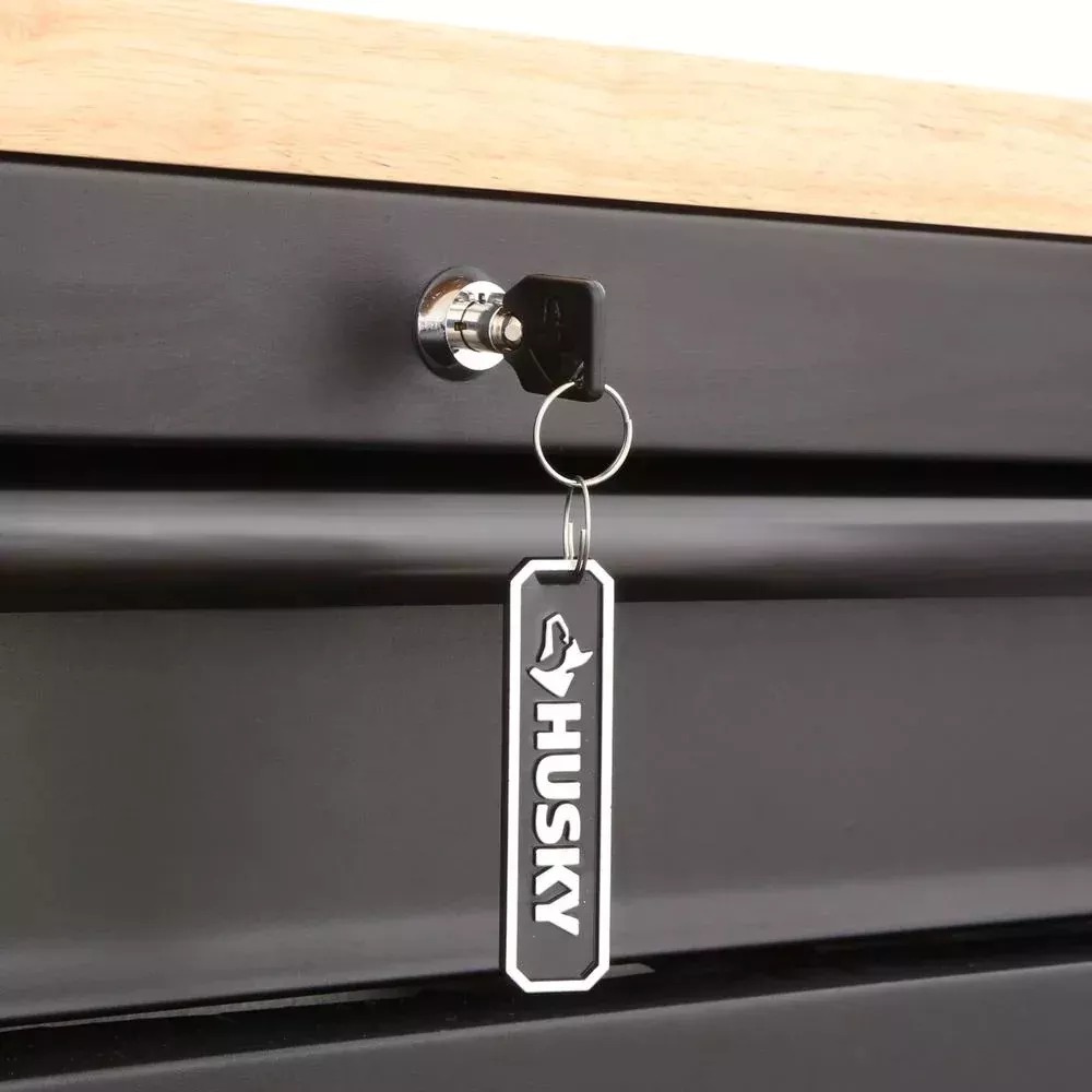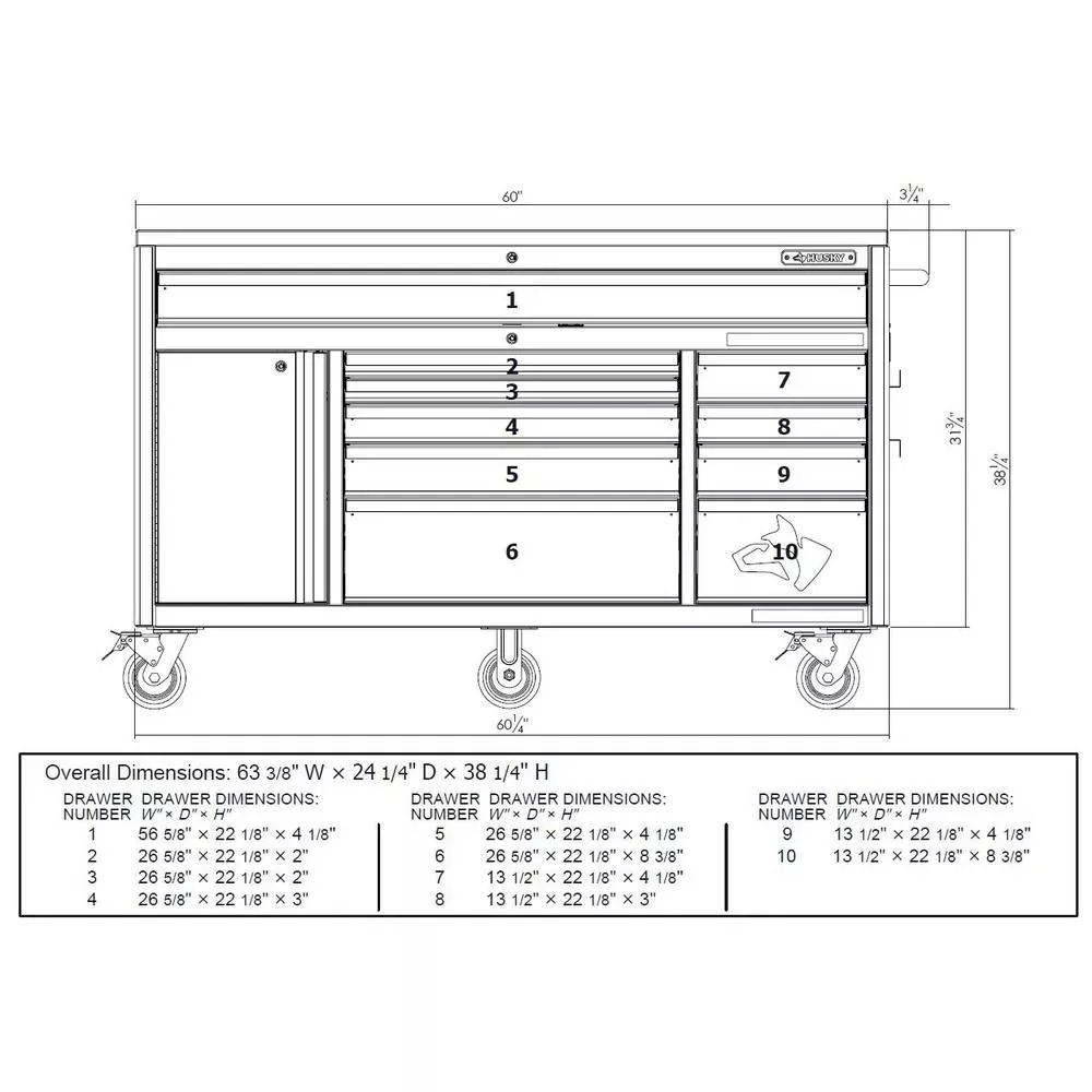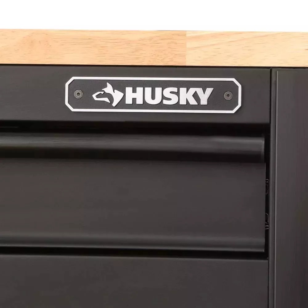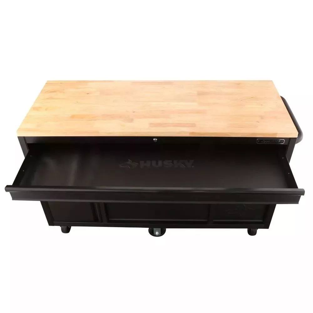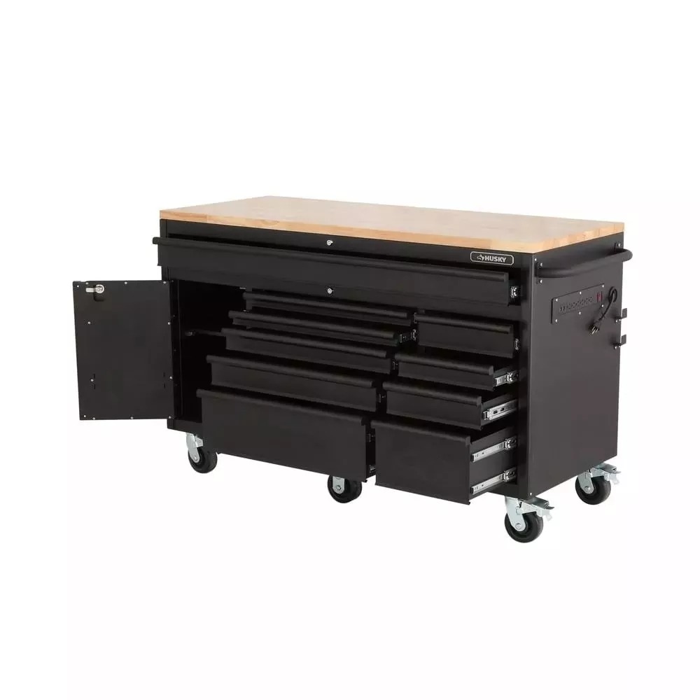 The Husky Heavy Duty 60.125 in. 10-Drawer 1-Door Mobile Workbench is massive with 26551 cu. in. of storage space and 2200 lb. load capacity. Built to take on any project the upgraded features were thoughtfully designed into this steel storage masterpiece. This rolling tool cabinet has heavier 19-Gauge steel. This workbench is 24 in. deep which is 6 in. deeper than most standard rolling tool cabinets providing more usable storage space. The 1.2 in. thick solid wood top is coated with polyurethane for added utility and durability. Charge your power tools with the built-in 6-outlet 2 USB power center. The 100 lbs. rated soft-close drawer slides keep the drawers from accidentally opening or from slamming shut. The full length drawer provides convenient storage for longer items. Drawer liners are included to protect and keep your tools in place. The two deep bottom drawers have increased weight capacity limits of 200 lbs. each with double 100 lb. drawer glides. These drawers offer additional storage for your larger items including power tools. The 1-door storage locker has a storage area that is 13.64 in. W x 20.4 in. H and includes an adjustable-height shelf that can handle a 100 lb. load. There is a side shelf for bottle and can storage on inside of door. For added security both the chest and cabinet are fitted with a barrel key and lock system. This toolbox weighs in at 405 lbs. so the 5 in. x 2 in. industrial grade casters with easy locking pedals role smoothly.