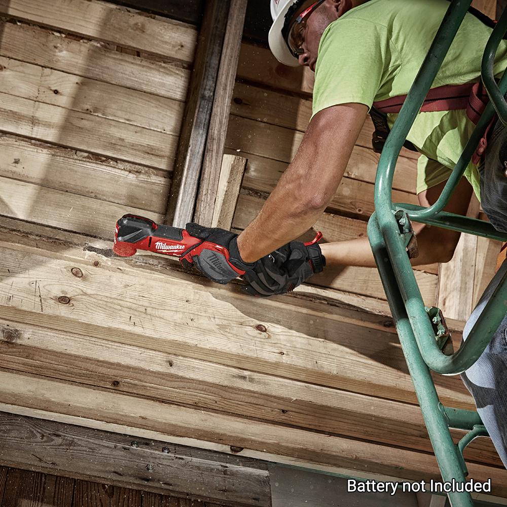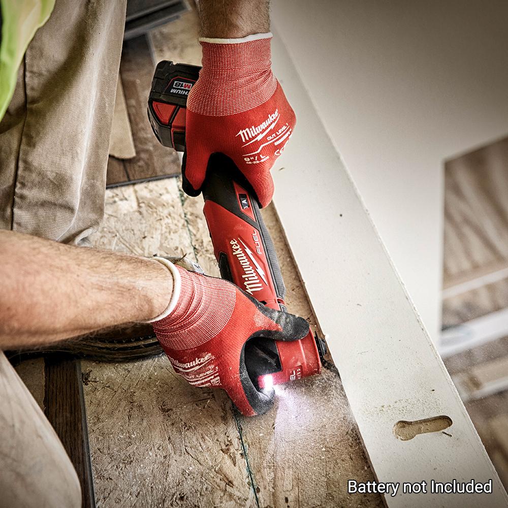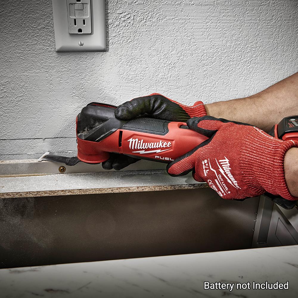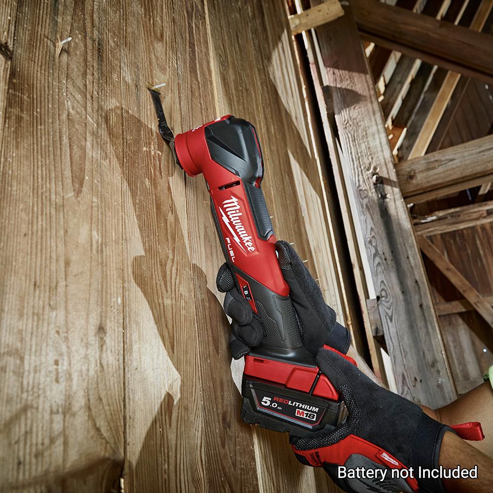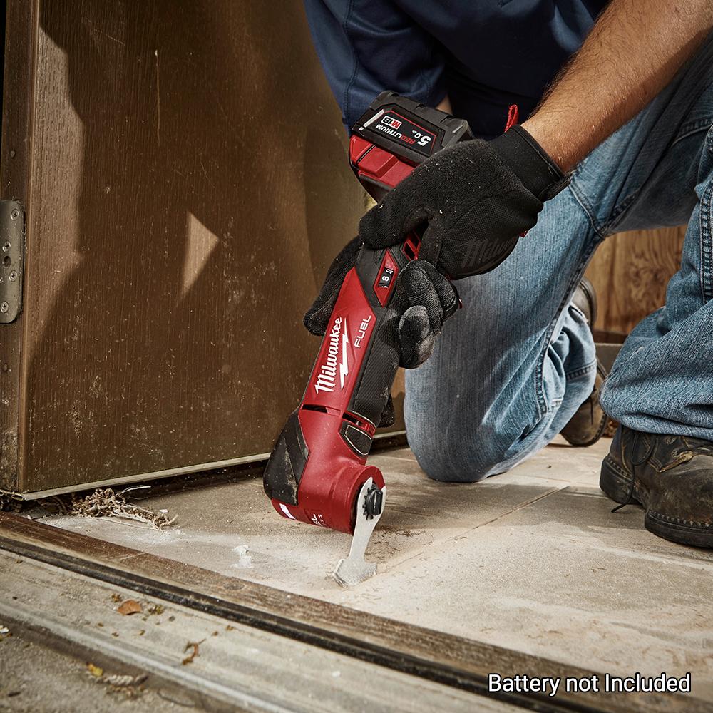 The MILWAUKEE M18 FUEL Multi-Tool generates fast cuts, the power for demolition, and low full tool vibration. The POWERSTATE Brushless Motor delivers 10,000 to 20,000 OPM, with an aggressive 4.2° oscillation angle to deliver fast cuts. The Multi-Tool also gives users the power to complete many demanding applications with ease, such as large cuts through hardwoods and nail embedded wood, removing grout, or tackling other jobs. Vibration dampening technology delivers low full tool vibration, letting the user make cuts more comfortably, and with less fatigue. REDLINK PLUS Intelligence ensures optimal levels of performance, protection, and compatibility between the tool and batery. To allow users to adjust speed to suit the application, the M18 FUEL Multi-Tool features a 10-setting Variable Speed Dial, with an additional Auto-Load feature. Auto-Load sees the tool start slowly when making precise cuts, before automatically ramping up to the highest speed once under load. Tool-free blade change makes accessory changes quick and means no misplaced tools and less down time on the jobsite. An integrated 180° LED light provides users maximum visibility in low-light situations.