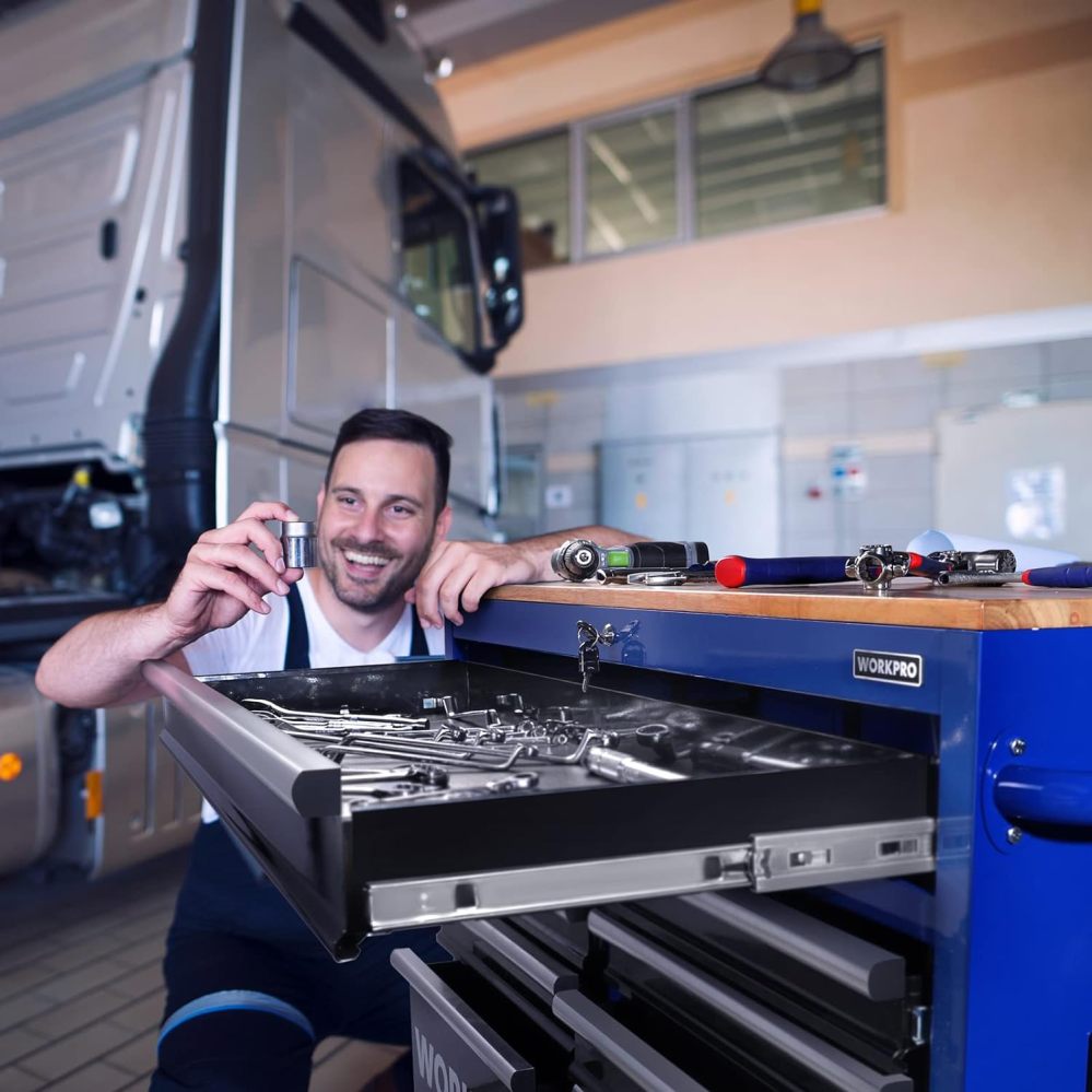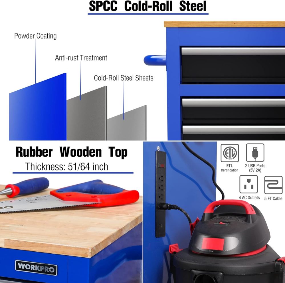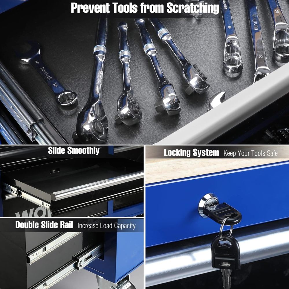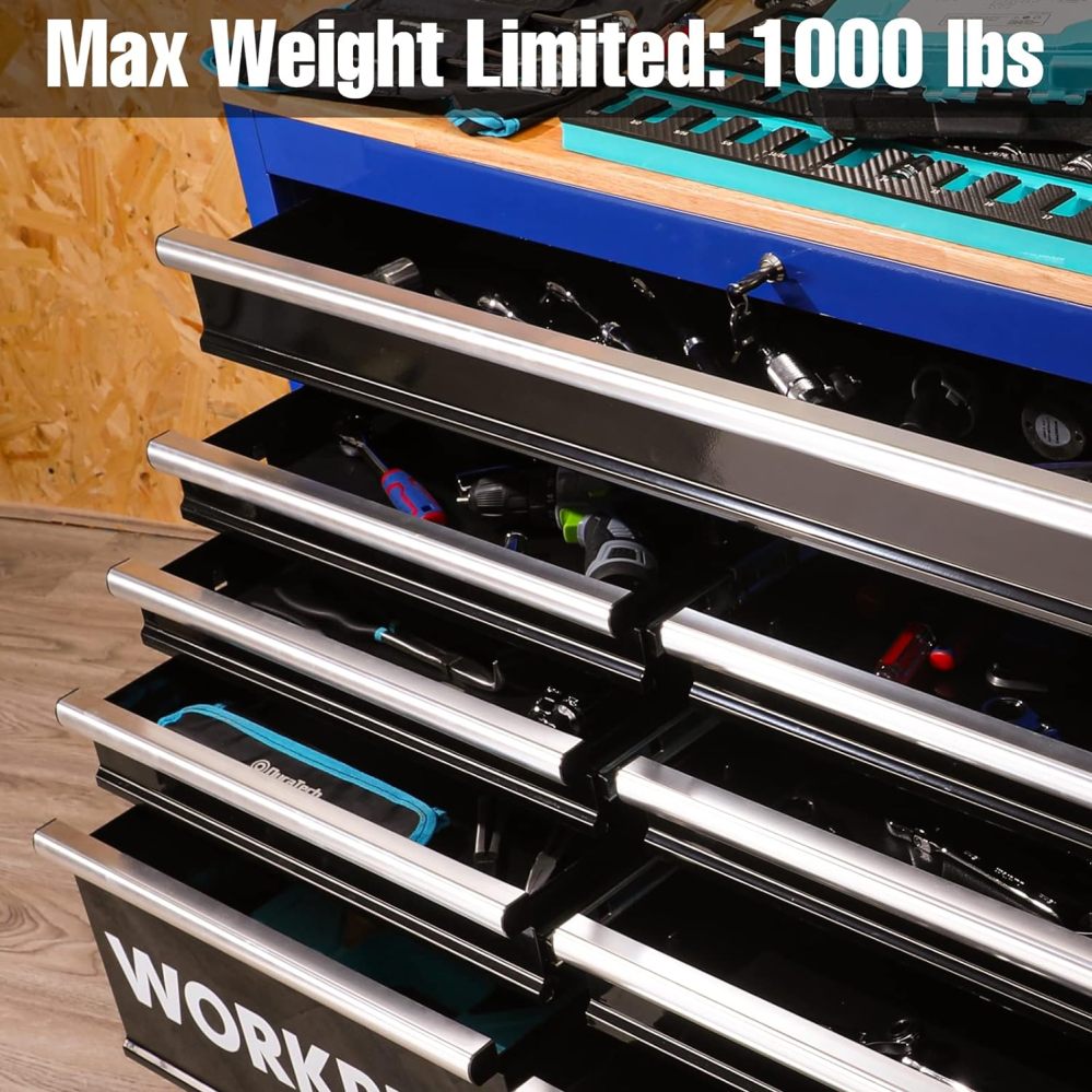 • WORKPRO 46-Inch 9-Drawers Rolling Tool Chest, Mobile Tool Storage Cabinet with Wooden Top, Equipped with Casters, Handle, Drawer Liner, and Locking System, 1200 lbs Load Capacity